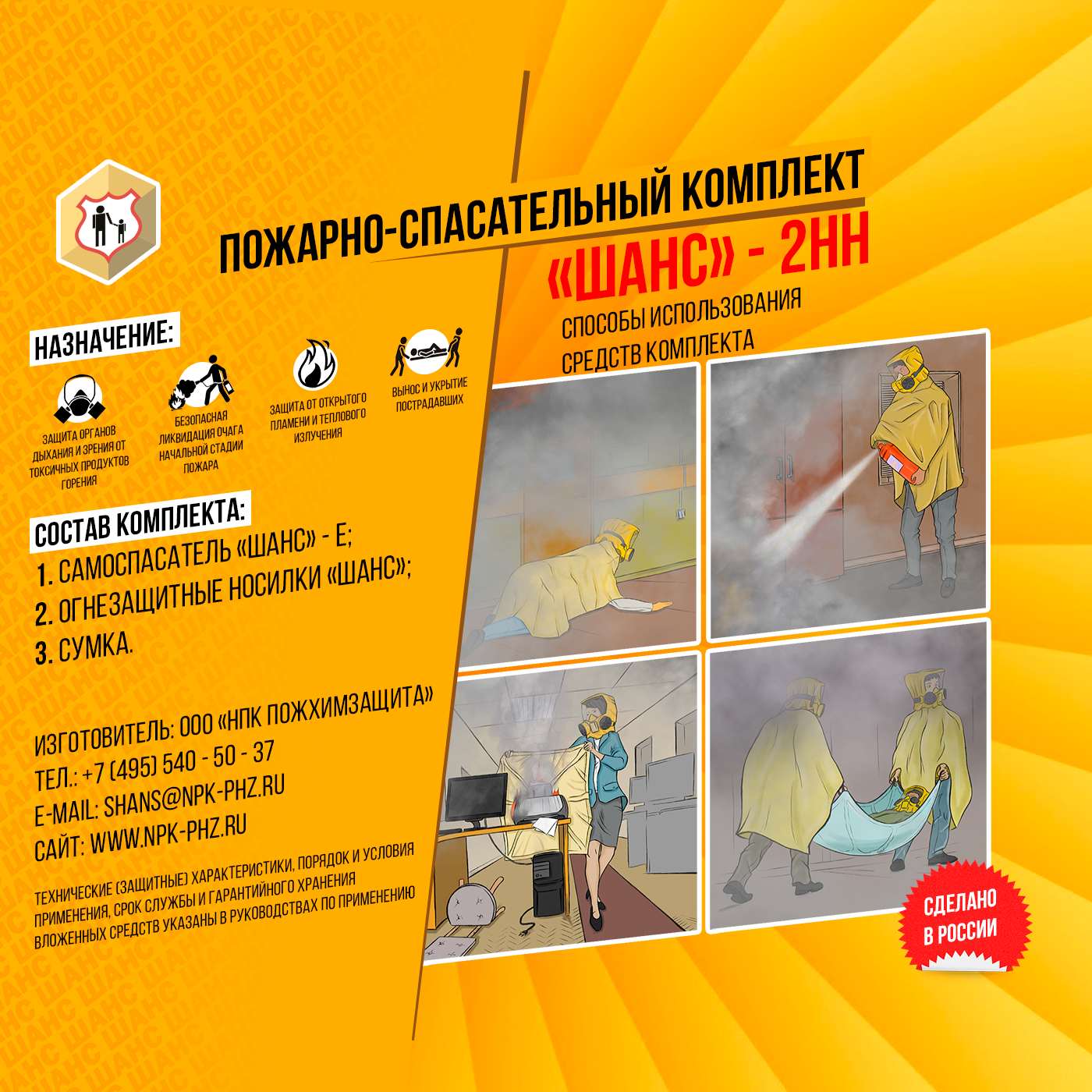 Компактно сформированный пожарно-спасательный комплект «Шанс-2Н»Н обеспечивает удобство хранения и позволяет комплексно и максимально эффективно использовать средства индивидуальной защиты в условиях воздействия открытого пламени и сильного задымления. Рекомендуется для больниц, для домов престарелых и инвалидов.