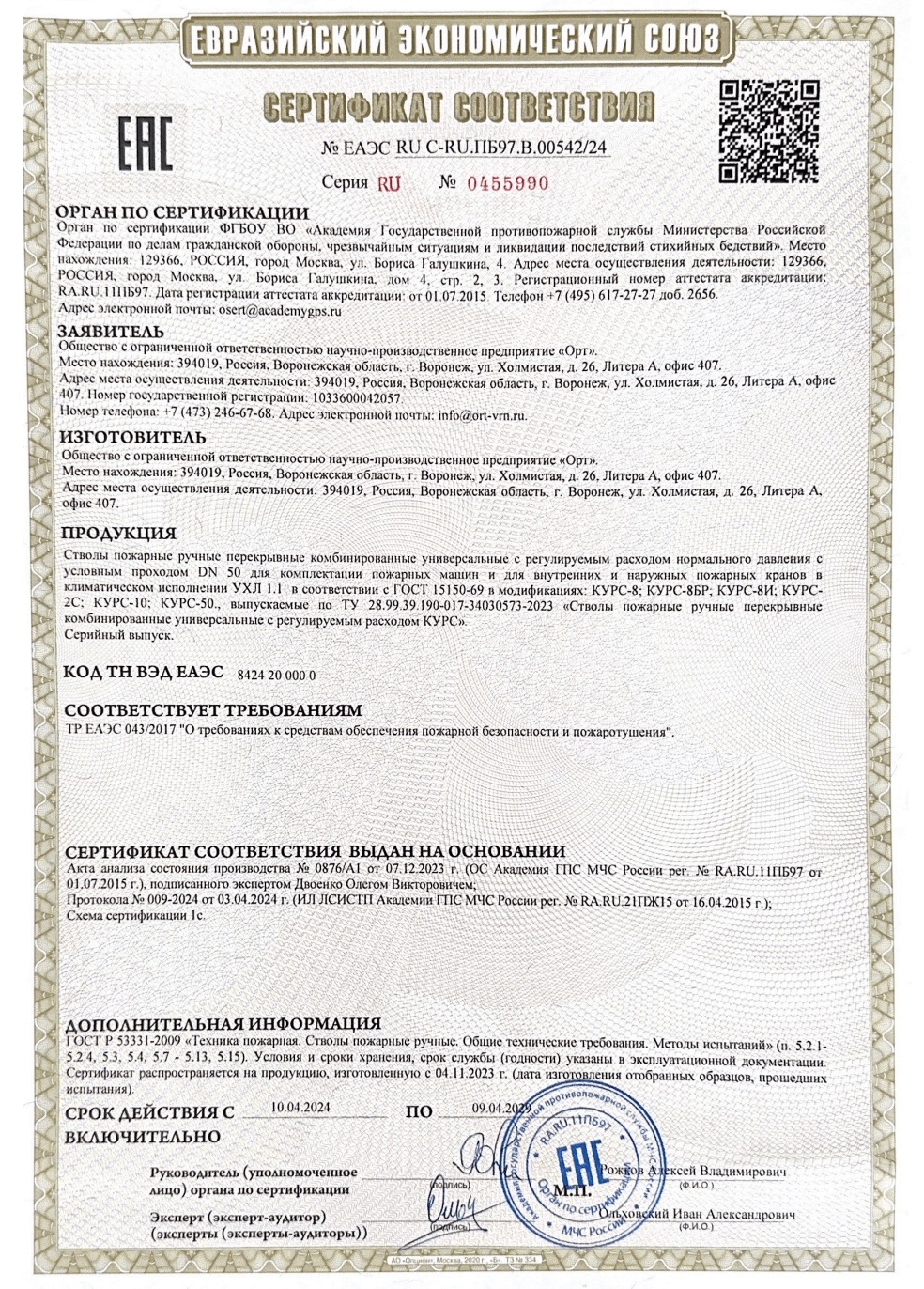 Ствол пожарный ручной перекрывной комбинированный универсальный с регулируемым расходом КУРС-10 ТУ 28.99.39-017-34030573-2023 предназначен для формирования и направления сплошных или распыленных струй воды, пены низкой кратности, пены средней кратности, а также для перекрытия потока огнетушащего вещества.